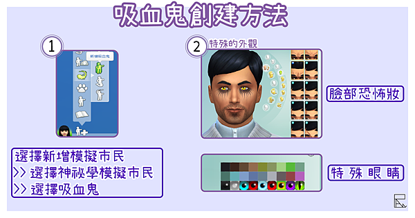 進入創建人物後,點選新增模擬市民後再選擇新增神祕學模擬市民,在這個選項裡就能選擇創建吸血鬼了! 創建吸血鬼有2個特殊的外觀裝飾可以選擇,其中一個是眼睛的顏色選擇變多,另一個則是臉部能選擇特殊的恐怖妝。