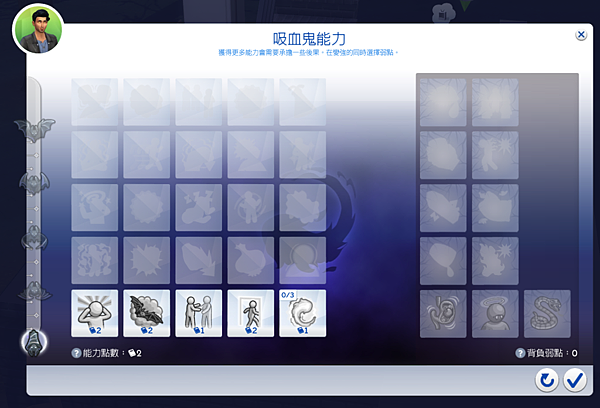 吸血鬼跟魔法師一樣都有專屬的技能書,可以透過選擇的技能來獲得一些有趣的能力,像是催眠別人等等,雖然可以獲得有趣的技能但是會被強迫選擇一些造成生活不方便的技能,背負弱點的點數必須要點擊完畢才能跟能力點數一起使用掉。