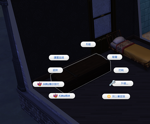 吸血鬼要補充吸血鬼精力的化,可以睡在一般模擬市民睡的床上,但是回復的效果比較差,使用棺材才能快速回復精力,棺材就像一張床一樣因此也可以讓吸血鬼點擊棺材進行傳宗接代等活動~